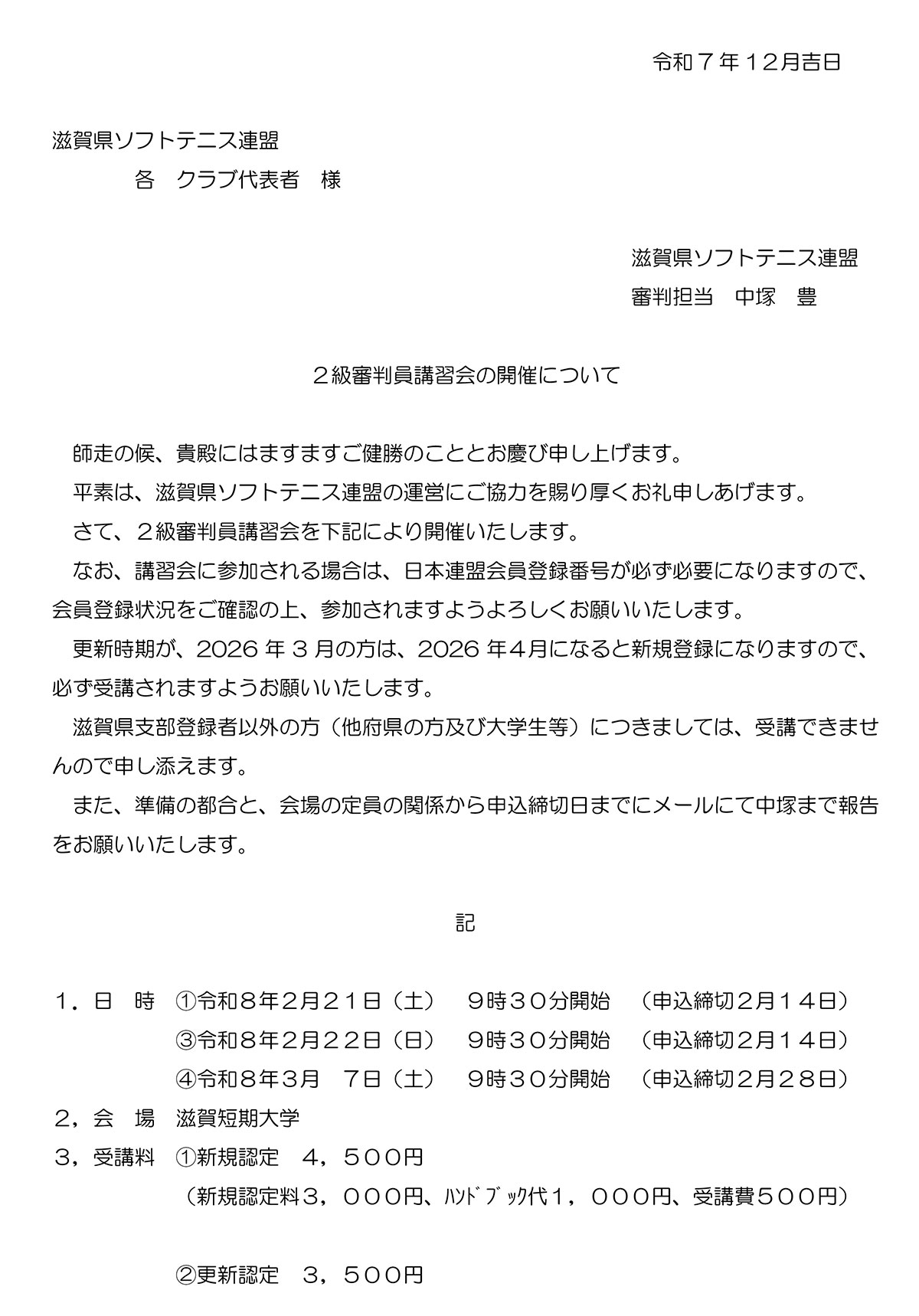 2級審判員講習会 案内文